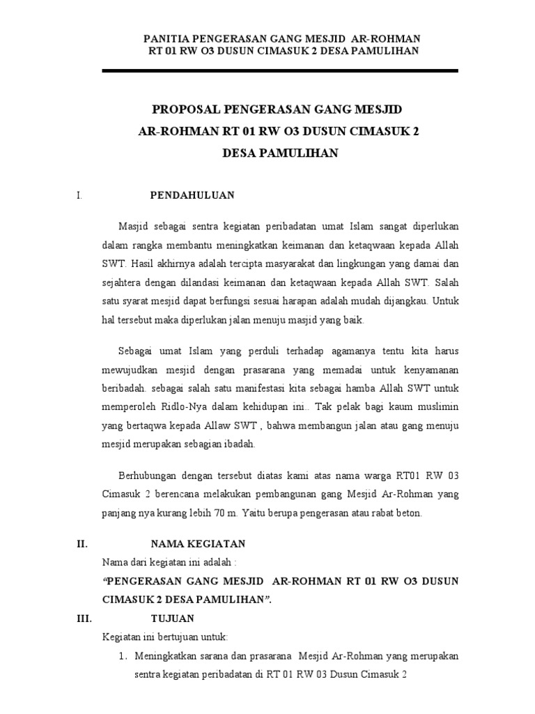 Admin blog berbagi contoh proposal 2019 juga. Tahap pendahuluan meliputi persiapan manajemen, bahan material, uji lapangan,desain gambar dari jalan gang rw. Sukasari rt 03/02 desa cibogohilir berikut contoh proposal ternak sapi : Itulah contoh proposal penerangan jalan lingkungan di pemukiman kelompok remaja pegadent kordent desa srowot kecamatan kalibagor kabupaten banyumas jalan pegadent indah rt 01 dan rt 02 rw 04 srowot nomor. Contoh proposal penelitian berikut berisi kumpulan proposal penelitian skripsi, tugas akhir, pkm, karya tulis dan masih banyak lagi. Contoh proposal perbaikan jalan lingkungan rt. Ustek database jalan lingkungan kecamatan. Lokasi kegiatan lokasi pembangunan wilayah rt 01/02 kelurahan mampang kecamatan pancoran mas kota depok luas perbaikan jalan i : Demikian proposal rencana pembangunan pavingisasi jalan di lingkungan rt 01 rw 01 desa bendanpete kecamatan nalumsari kabupaten jepara dengan harapan mendapat persetujuan dan hasilnya dapat bermanfaat bagi warga. Contoh proposal perbaikan jalan gang rw 02. Menjadikan jalan lingkungan untuk layak digunakan baik oleh penghuni gang raden fatah i dan sebagai akses oleh pemakai jalan lainnya penghibahan aset pribadi yang terkena kegiatan pembangunan jalan lingkungan gang raden fatah i, rt.04 rw.04 kel. Demikian usulan perbaikan jalan ini kami ajukan kembali proposal kirmiran jalan proposal. Contoh proposal perbaikan jalan gang rw 02.
